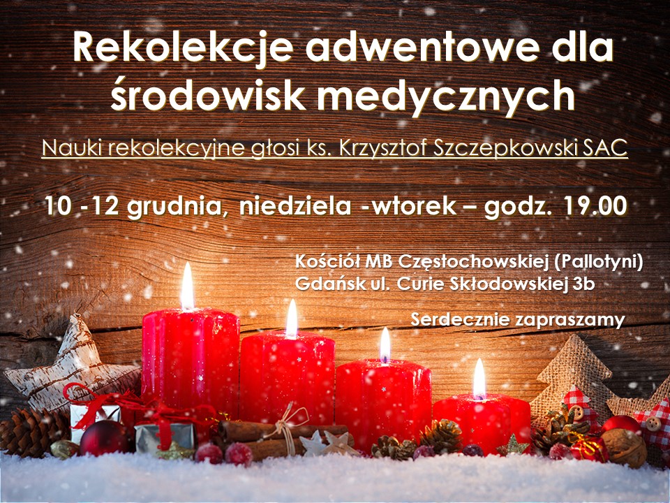 Zapraszamy na rekolekcje adwentowe dla środowisk medycznych w dniach 10-12 grudnia 2023 roku (niedziela-poniedziałek-wtorek) godz. 19:00 w Kościele MB Częstochowskiej (Pallotyni) w Gdańsku przy ul. Curie-Skłodowskiej 3b. Nauki rekolekcyjne wygłosi Ks. Krzysztof Szczepkowski SAC.