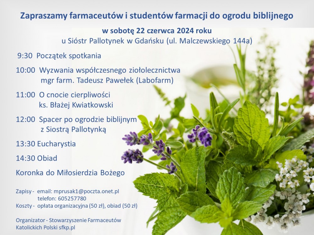 Bardzo serdecznie zapraszamy członków i sympatyków stowarzyszenia oraz wszystkich farmaceutów i studentów farmacji na spotkanie w ogrodzie biblijnym w dniu 22 czerwca (sobota) 2024 roku u sióstr Pallotynek w Gdańsku (ul. Malczewskiego 144a).