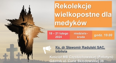 Zapraszamy na rekolekcje wielkopostne dla środowisk medycznych w dniach 18-21 lutego 2024 roku (niedziela-środa) o godz. 19:00 w Kościele MB Częstochowskiej (Pallotyni) w Gdańsku przy ul. Curie-Skłodowskiej 3b. Nauki będzie głosił ks dr Sławomir Radulski SAC, biblista.