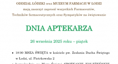 DUSZPASTERSTWO SŁUŻBY ZDROWIA ARCHIDIECEZJI ŁÓDZKIEJ, STOWARZYSZENIE FARMACEUTÓW KATOLICKICH POLSKI KOłO ŁÓDZKIE oraz MUZEUM FARMACJI W ŁODZI mają zaszczyt zaprosić wszystkich Farmaceutów, Techników farmaceutycznych oraz Sympatyków na świętowanie DNIA APTEKARZA w piątek 26 września 2025 roku.